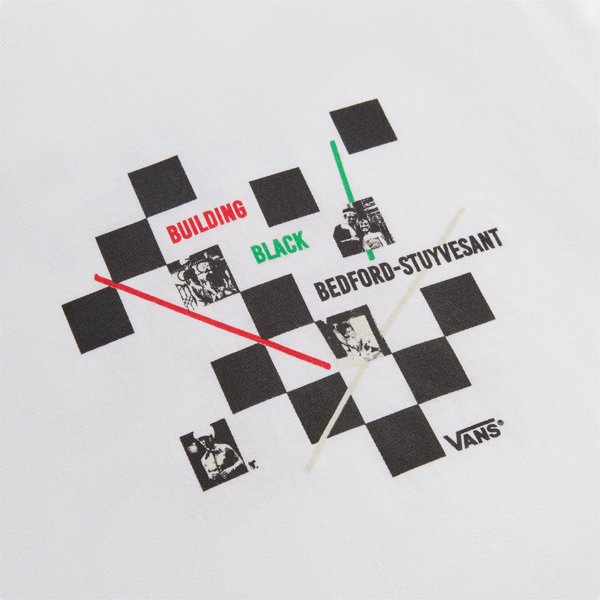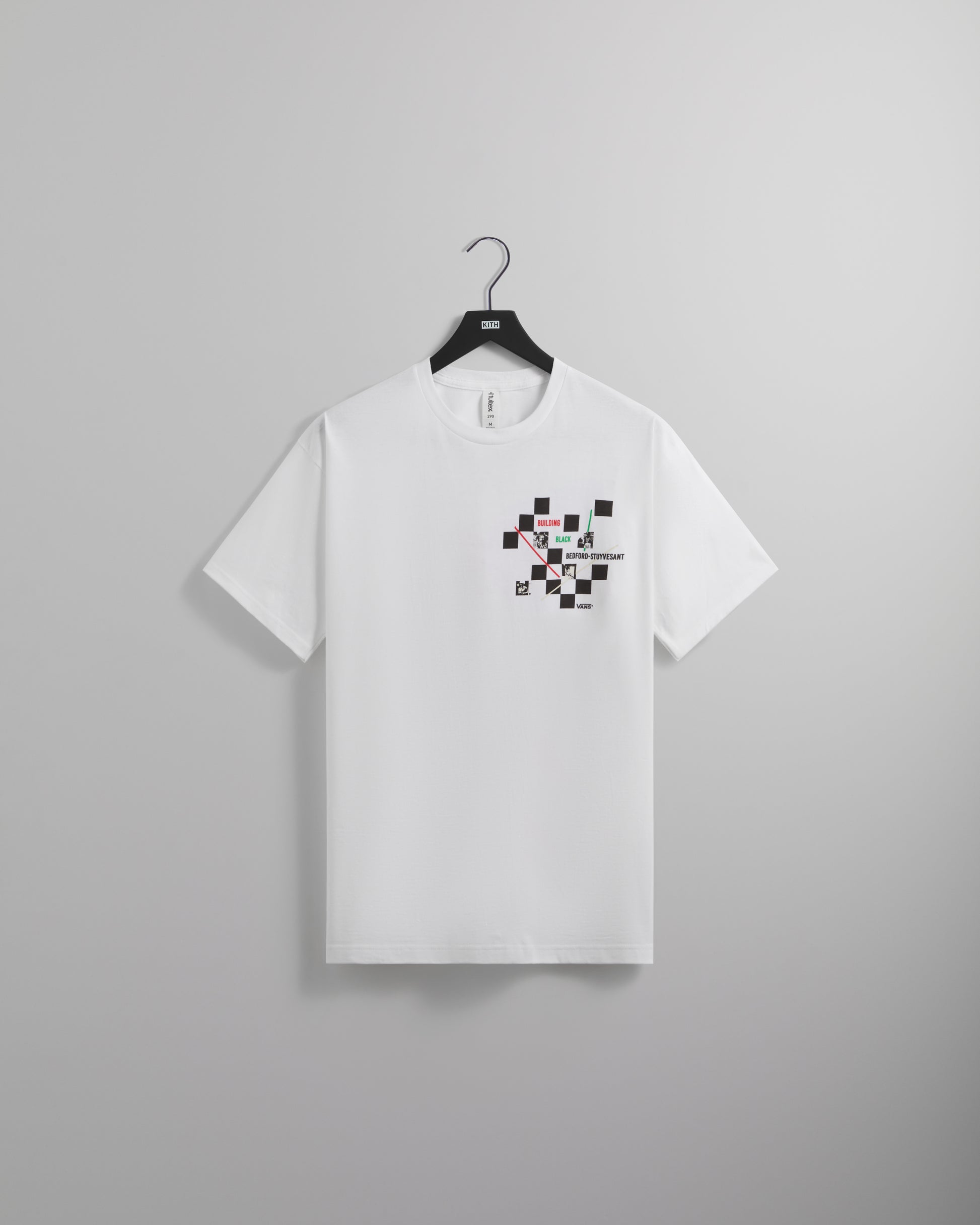 Vans & Kith - Love Thy Community Exclusive design for the Black Bedstuy Collab. Short sleeve white cotton tee featuring integration of classic Vans checkerboard design and BBB mantra references. 100% of the sales will go to the fundraising efforts of Building Black Bedstuy for their 2023 round of raising money for 3 local Black businesses and organizations.